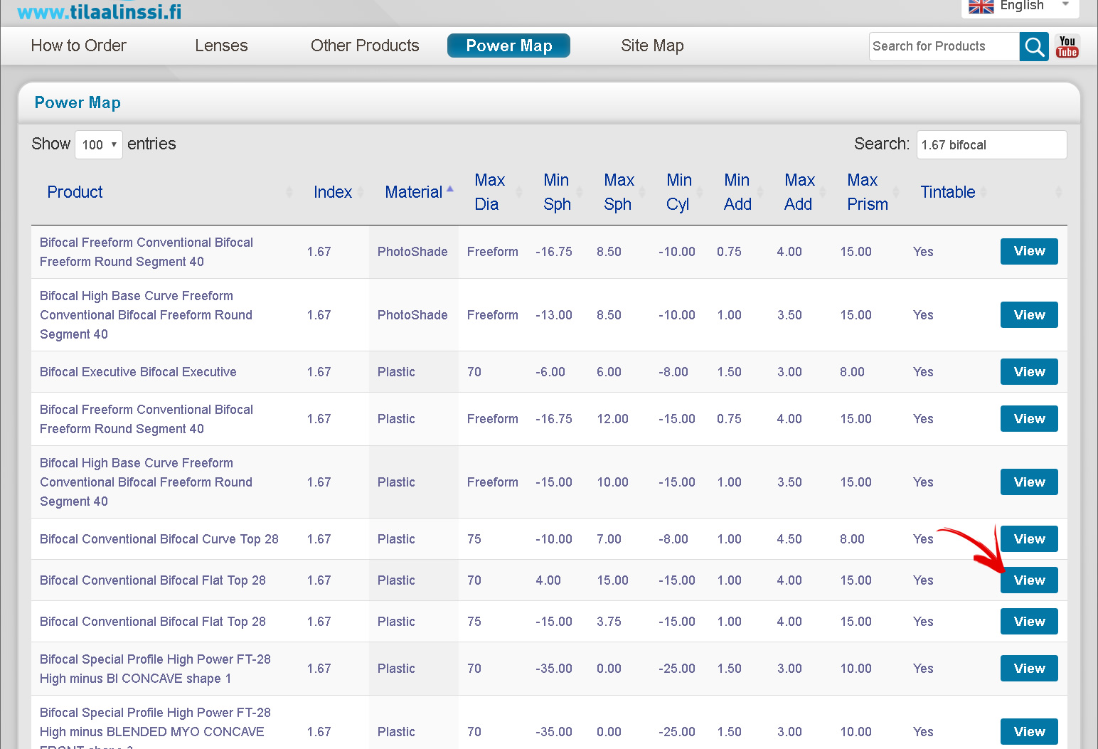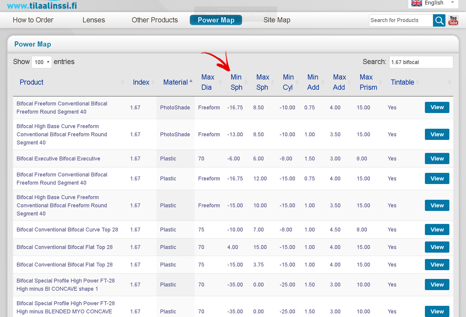 The Power Map will show all products that we can offer in 1.67 Bifocal. It also show the product power range, which you can sort by power, material etc.